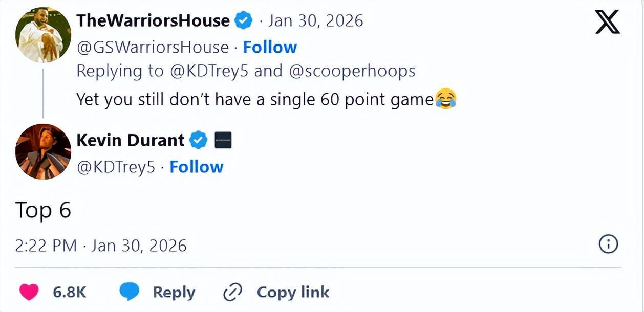 还有球迷提醒他生涯至今尚未单场砍下过60分,杜兰特则留言:“Top 6”。显然,是告诉球迷,自己近期刚跻身NBA历史得分榜第六位。